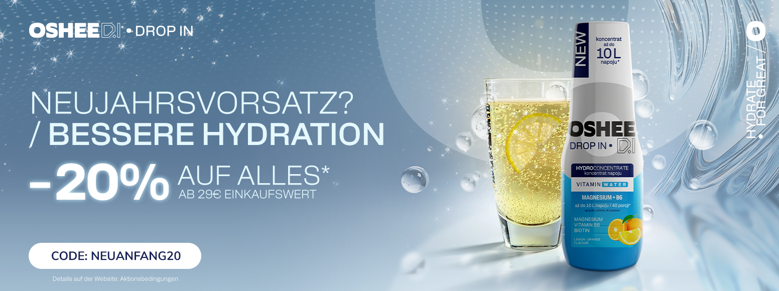 OSHEE Drop In ist die neue Art der Flüssigkeitszufuhr, die auf der Expertise und Erfahrung der Marke OSHEE basiert. Es sind funktionelle Getränke, die Sie bereits kennen, jedoch in Form von Hydrokonzentraten, die einfach zu verwenden sind – fügen Sie einfach die richtige Menge zu Sprudelwasser oder stilles Wasser hinzu. Getränke mit Elektrolyten und Vitaminen im Hydrokonzentrat OSHEE DROP IN sind eine Alternative zu abgefüllten Produkten.