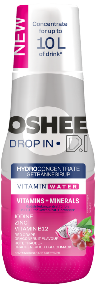 OSHEE DROP IN D.I eignet sich zur Zubereitung eines funktionellen Getränks, sowohl mit stillem Wasser als auch mit Sprudelwasser, auch unter Verwendung von Sprudelgeräten. Sie entscheiden selbst über die Intensität des Geschmacks und Kohlensäuregehalt! Jede Portion enthält Vitamine und Mineralien, sodass die Getränke zur täglichen Hydration verwendet werden können.